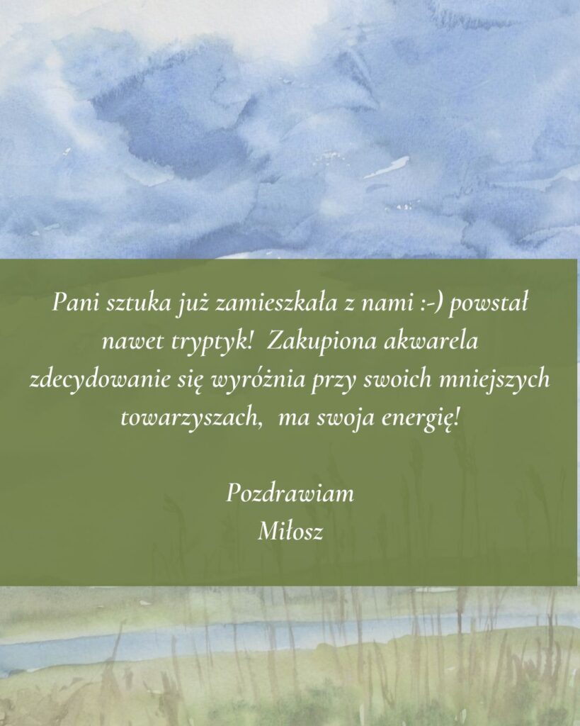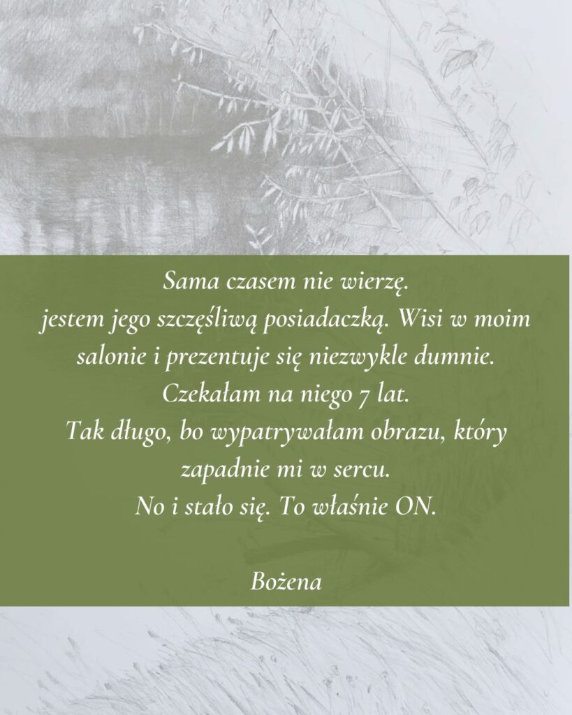 Moja sztuka zaprasza do zatrzymania się i uważnego patrzenia, do życia w prostocie i bliskości natury. W jej obecności można odpocząć, zwolnić tempo, odetchnąć i wrócić do wewnętrznej równowagi. Obrazy inspirowane naturą pomagają zaakceptować zmienność i przemijanie, a przede wszystkim przenoszą z kanapy w miejsca zapisane głęboko w sercu. Przypominają, że piękno nie potrzebuje być doskonałe, a spokój rodzi się ze zgody na to, co jest.