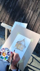 Spotkaliśmy się w bardzo kameralnym gronie. Tym razem oprócz tłumaczenia na czym polega tajny składnik dobrego obrazu, miałam okazję przekazać wiedzę na temat zasad rysowania architektury, perspektywy i proporcji. Przyznam, że zrobiłam to w sposób na tyle prosty i przystępny, że jedna z uczestniczek, która początkowo postanowiła namalować latarnię, (bo architektura to nie jej bajka) wróciła do domu z piękną akwarelą kościoła.