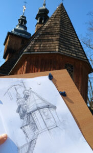 W tym roku postanowiłam powtórzyć ten plener, tym razem pod koniec kwietnia, kiedy na drzewach pojawią się liście, ale nie będzie ich jeszcze tak dużo, żeby przesłoniły bryłę kościoła. Mam zgodę i zaproszenie od Księdza Proboszcza, więc jeszcze nieoficjalnie, ale już po cichu zapraszam do udziału w plenerowych warsztatach.